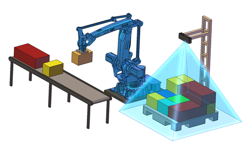 案例1:3D相机安装在传送带旁,对传输带上的箱型货物进行3D拍照,获得被抓取箱体的点云,通过对点云进行一定的处理将待抓取箱体的抓取点位姿发送给机器人,机器人结合箱体位姿信息和传送带运动情况,对箱体进行抓取,最后将箱体进行码垛。