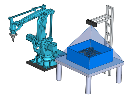 案例3:针对货框内随意摆放的零件,通过3D相机成像,结合公司视觉处理软件和自研的深度学习方法,可实现对货框内零件的无序抓取功能,并可对抓取路径进行轨迹规划,防止抓取过程中出现碰撞等情况。