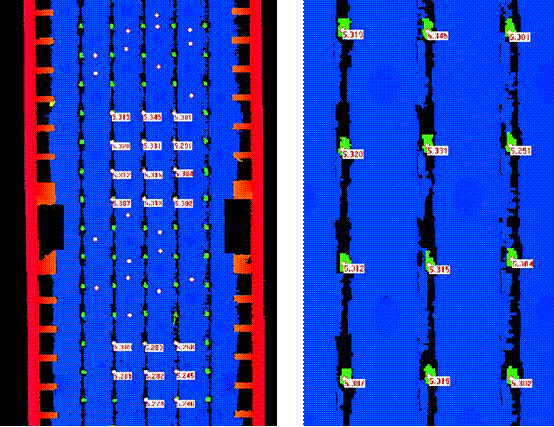 对产品进行3D成像,获得点云,并在KZVision视觉处理软件中对点云数据进行处理,在正面底座选20个点作为平面,随机选12个针脚顶部,测量高度差,如下图所示: