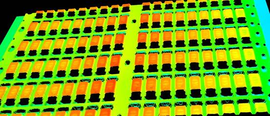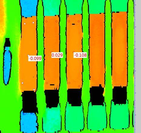 并在KZVision视觉处理软件中对点云数据进行处理,如下图所示,在基准面和测量位置各选一点测量点到平面的高度差,如图一所示选了三个位置的点到平面的高度差测量位置: