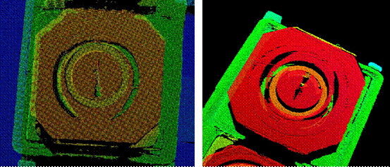 对产品进行3D成像,获得点云,并在KZVision视觉处理软件中对点云数据进行处理,在测量点和基准点各选1点,测量两点高度差,共两组,如下图所示: